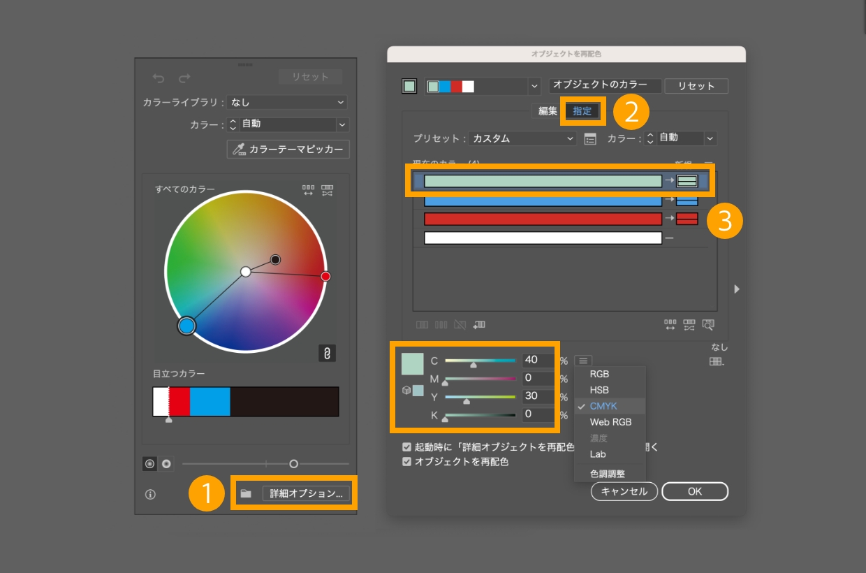 「指定」タブで変更したいカラーの行をクリックし、カラースライダーで、1段目「C=25 M=10 Y=5 K=0」、2段目「C=0 M=0 Y=0 K=100」、3段目「C=0 M=70 Y=15 K=0」に変更しましょう。