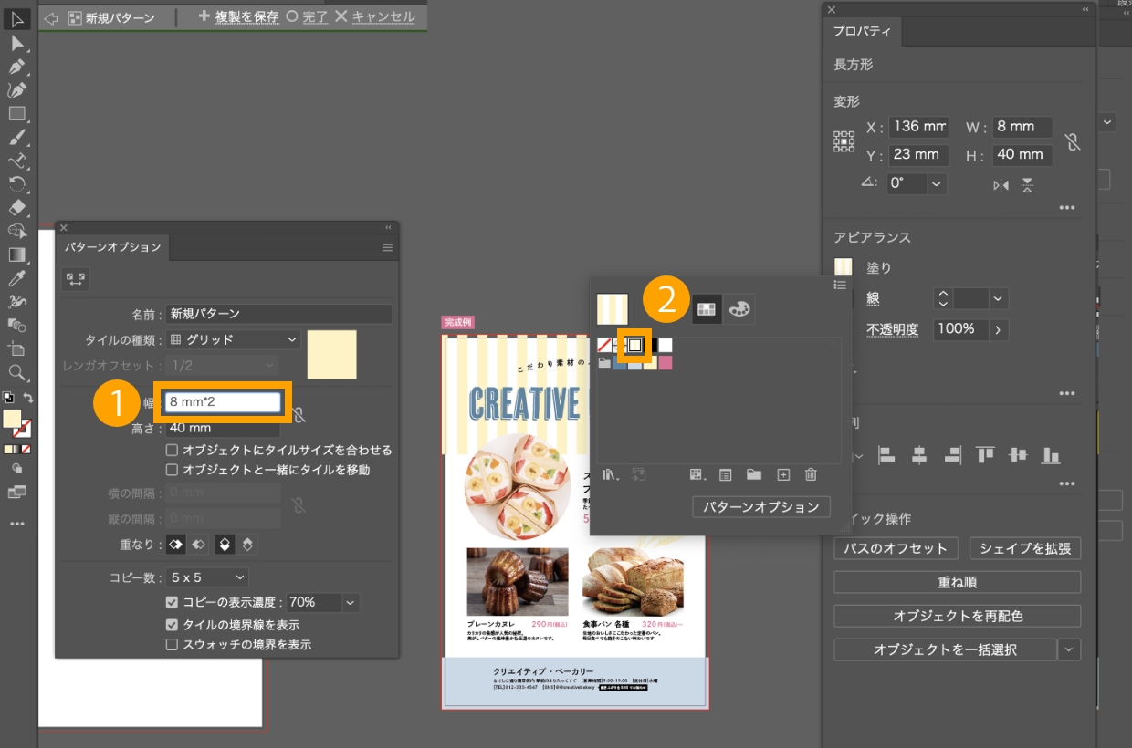 パターンオプションパネルで「幅」の末尾に「*2」を入力し、タイルの幅を2倍にします。タイルの左右に均等なスペースが生まれてストライプのパターンになります。画面上部の「完了」のクリックまたはescキーでパターン編集モードを終了しましょう。
