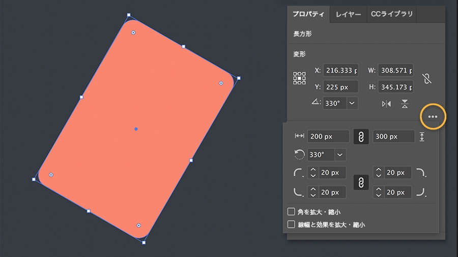 プロパティパネルの「変形」セクションでは、シェイプのサイズ、回転角度、およびその他の属性を変更できます。詳細オプション(...)をクリックすれば、角の種類など、シェイプのその他のプロパティを表示できます。