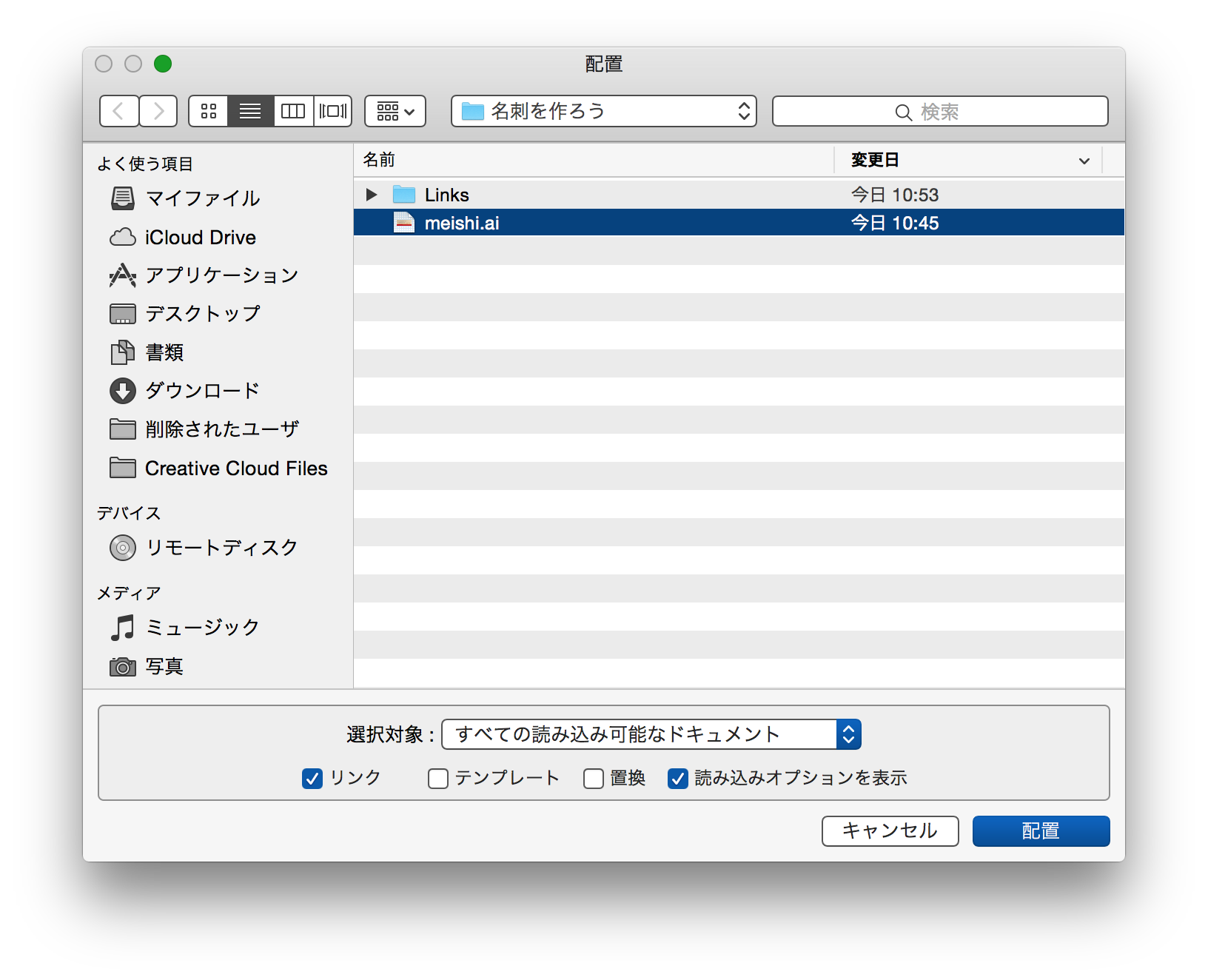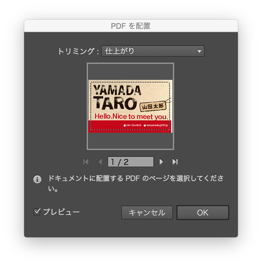 先ほど保存しておいた名刺データを配置します。「ファイル>配置」をクリックし、名刺データを選択します。その際、下部のオプションから「リンク」と「詳細オプション」にチェックをいれて配置しましょう。「詳細オプション」ダイアログでは「トリミング:仕上がり」を選択します。