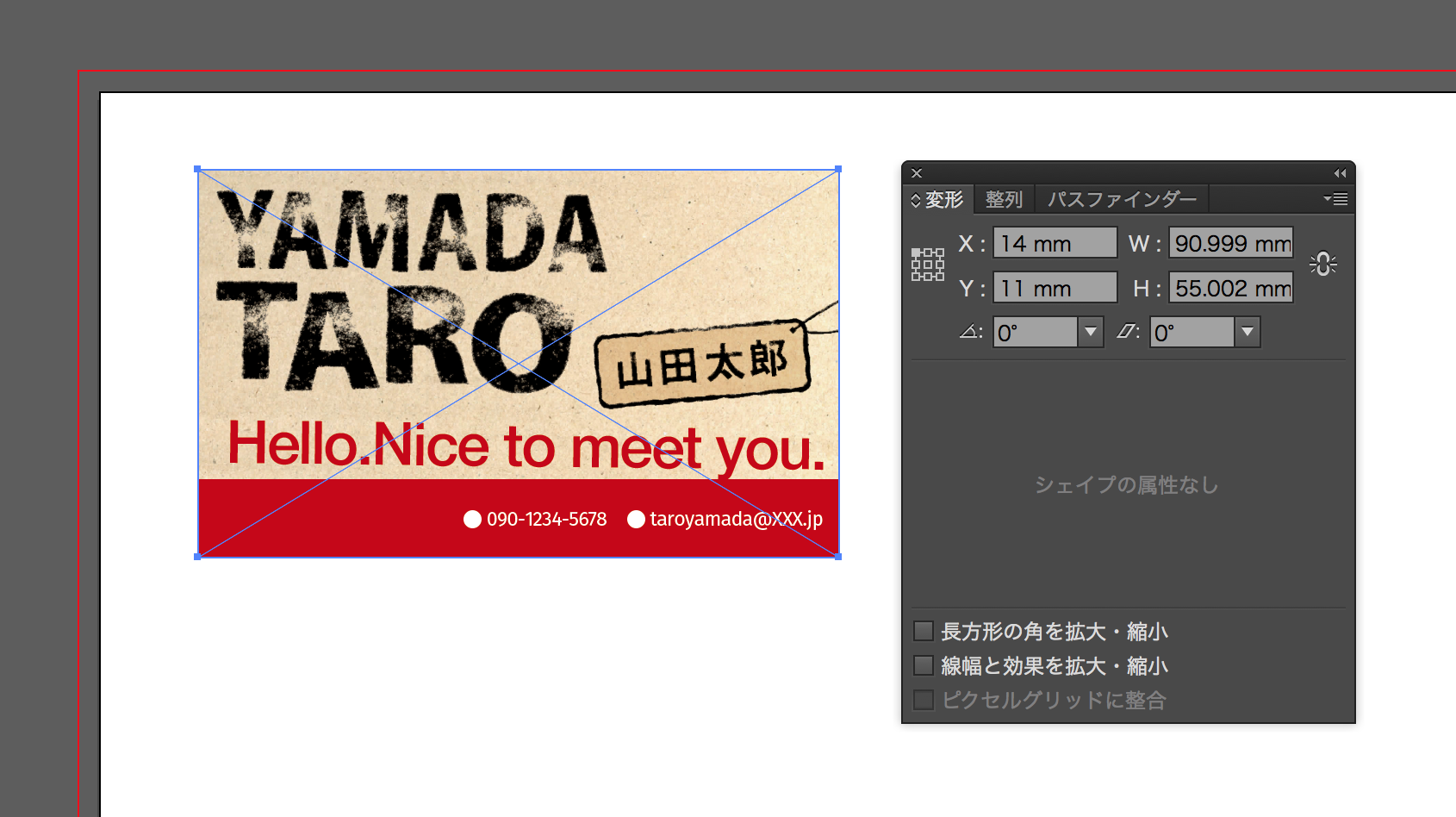 アピアランスを設定したオブジェクトとアドレスや携帯番号を入力したテキストオブジェクトをレイアウトして名刺を完成させましょう。最終的に印刷サービスビューローに入稿する際には、PDF での入稿をお勧めします。PDF の作成方法は間違いのない入稿データ作りを参考にしてください。