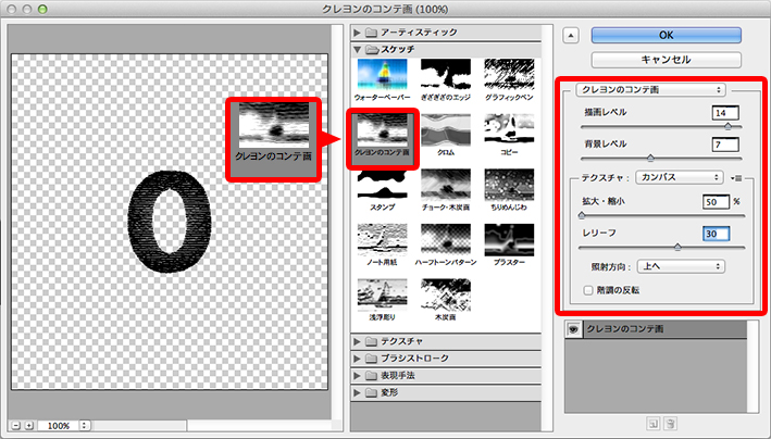「塗り」の項目を選択した状態で、効果メニューから「スケッチ>クレヨンのコンテ画」を実行し、パラメーターを設定します。