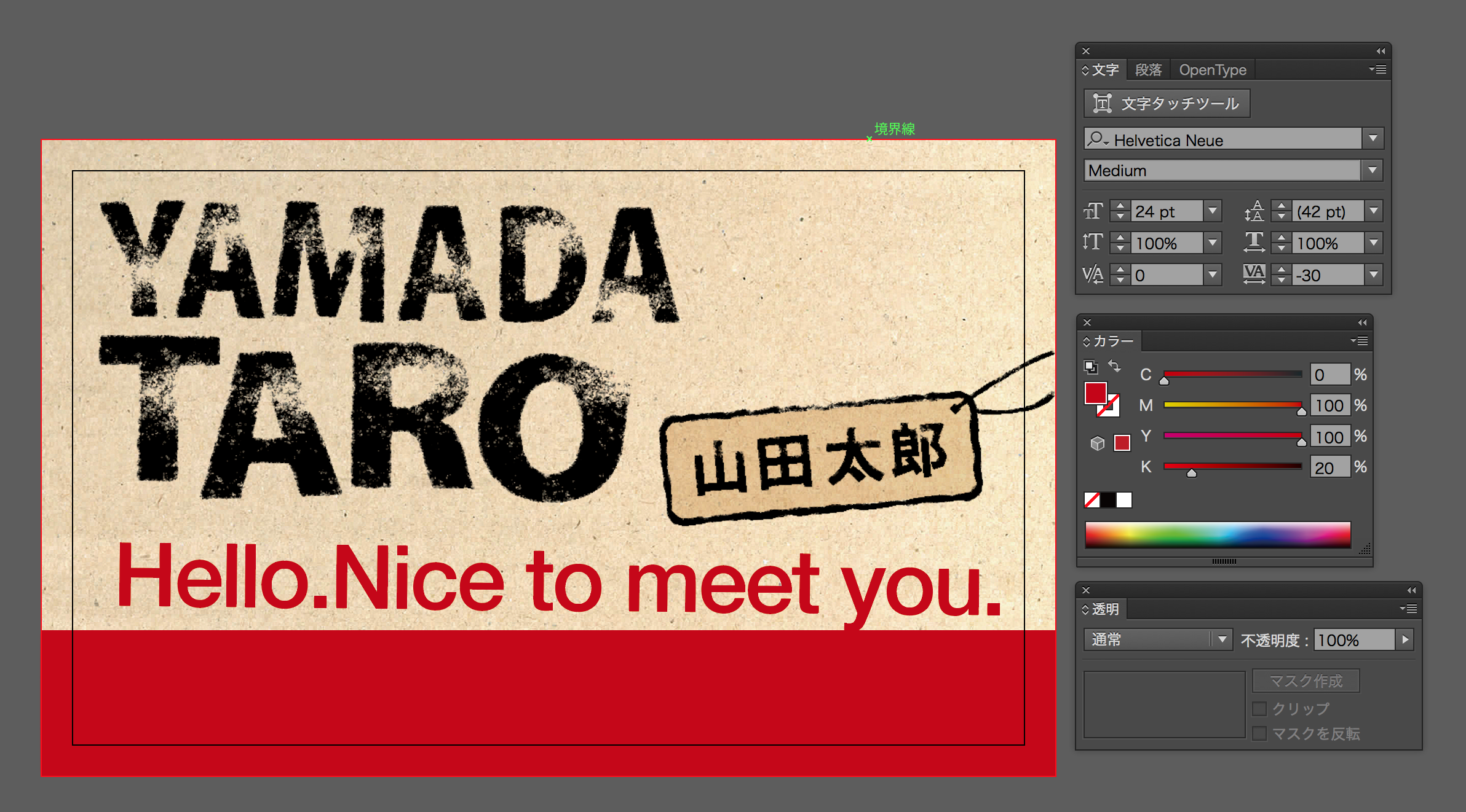 実際にテキストを入力するとわかりますが、24ptでは名刺の横幅に収まりきれません。しかし、テキストサイズを小さくしてしまうと全体のバランスが崩れてしまいます。そこで、今回はトラッキングを調整することで、文字間隔を詰め、横幅に収まるように調整しました。トラッキングとは、個々の文字が持つ固有の隙間を指します。テキストオブジェクト全体でトラッキングをマイナスに設定することで、各文字間の隙間が詰められ、横幅を短くすることができます。