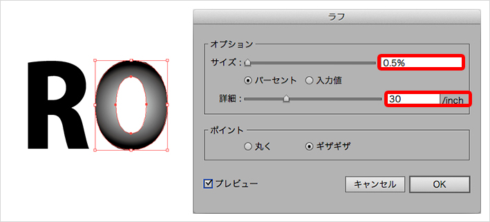 続いて、効果メニューから「パスの変形>ラフ」を実行します。アピアランス全体に効果を適用させるので、項目を選択しない状態で効果を実行してください。【ラフ】サイズ:0.5% 詳細:30/インチ ポイント:ギザギザ