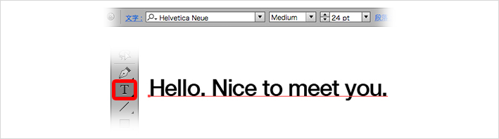 次にメッセージとなるテキストを入力します。テキスト入力後、フォントを「Helvetica Neue」に設定し、サイズには「24pt」と入力します。選択ツールに持ち替え、バウンディングボックスを利用して、文字オブジェクト全体を少しだけ右に回転させます。