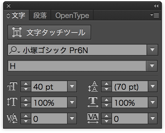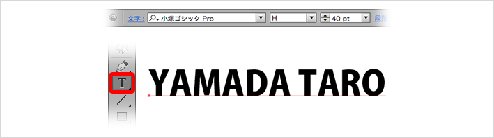 まずは文字ツールを使ってテキストを入力します。テキストオブジェクトを選択し、コントロールパネルから「小塚ゴシック Pro H」を選び、サイズを40ptとします。