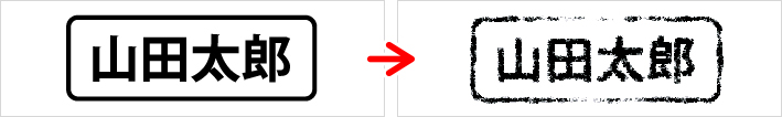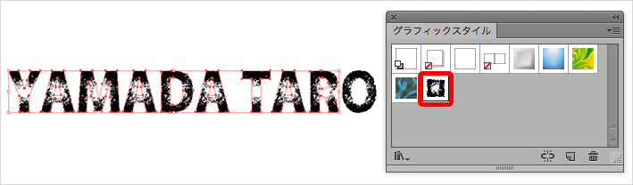 オブジェクトにビットマップの効果を設定し、通常のテキストをスタンプ風に変換します。アピアランスにいくつかの効果を設定することで、インクのかすれを表現することが可能です。