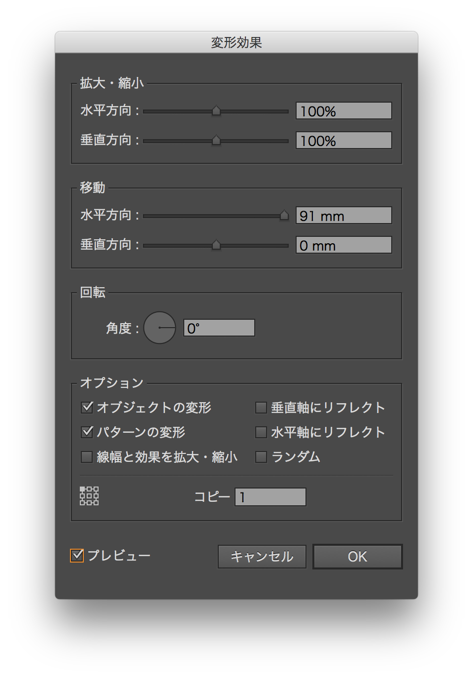 オブジェクトを選択した状態で「アピアランス」パネルから、「Illustrator効果>パスの変形>変形」を選択し、数値を入力するダイアログが表示されるので、「水平方向:91mm」「垂直方向:0mm」、と入力し、基準点を左上に設定、「コピー:1」と入力します。プレビューにチェックを入れると、オブジェクトを右横に移動させ、同時にコピーを作成することができます。OKをクリックします。