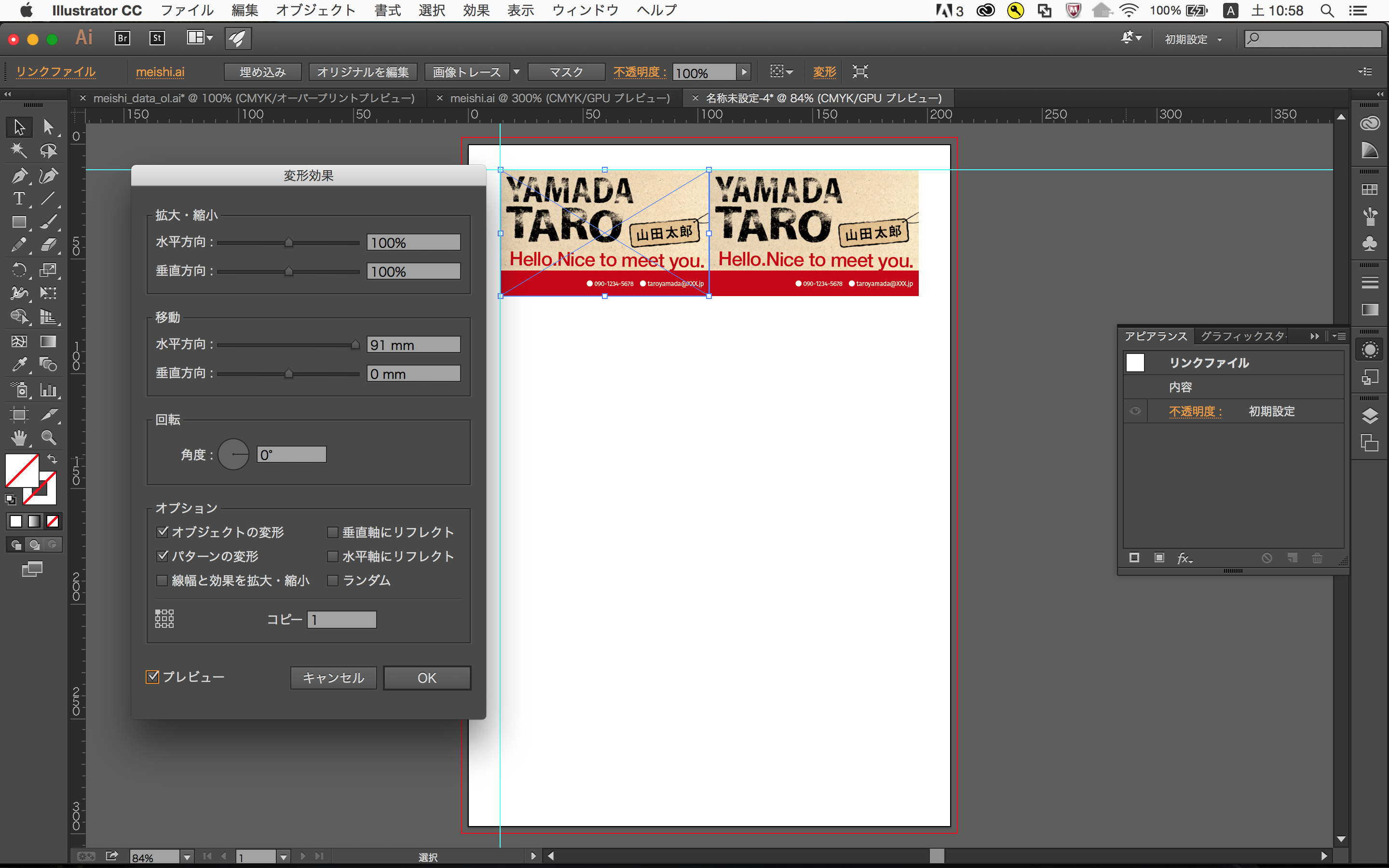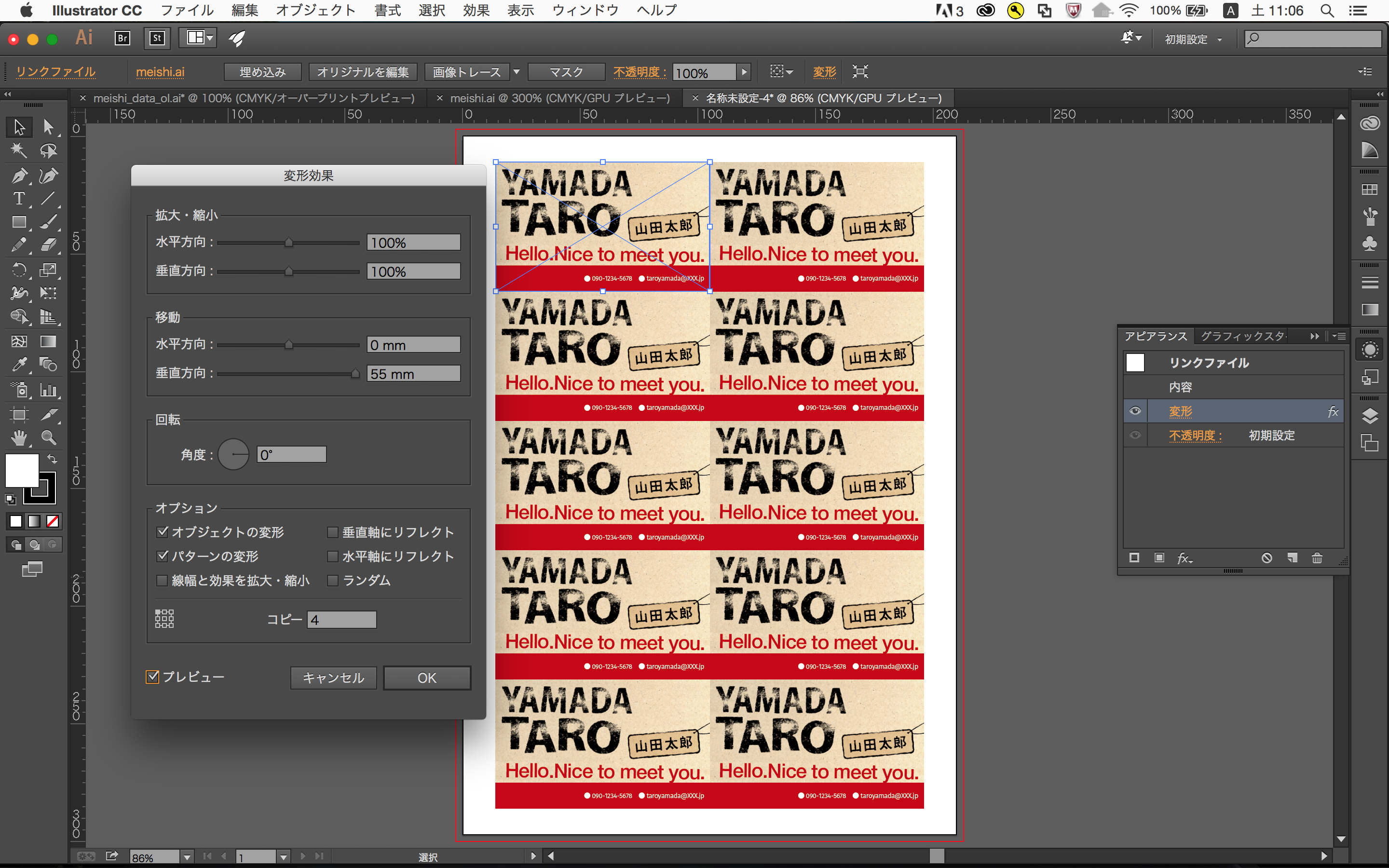 同様の手順で、今度はオブジェクトを縦方向へ移動コピーさせます。同じオブジェクトを選択し、同様に「アピアランス」パネルから、「Illustrator効果>パスの変形>変形」を選択します。新規効果を追加するかというダイアログが表示されるのでOK をクリックします。先ほどと同じダイアログが表示されるので「水平方向:0mm」「垂直方向:55mm」と入力し、基準点を左上に「コピー:4」としてプレビューボタンを押します。これで10面分の名刺データが作成できたことになります。あとは「ファイル>プリント」を実行して名刺をプリントするだけです。