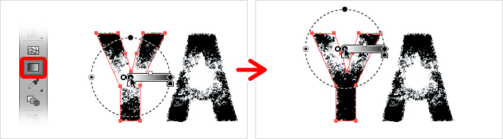 グラフィックスタイルを適用後、オブジェクトを選択した状態でグラデーションツールを選択するとグラデーションスライダーが表示されます。グラデーションスライダーの位置を調整することで、「かすれ」の位置が変わり、より自然なスタンプの雰囲気を表現できます。