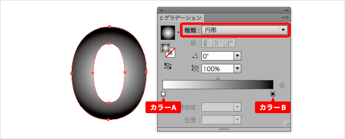まずは、アウトライン化されたオブジェクトをひとつ選択し、オブジェクトの「塗り」に円形のグラデーションの設定をします。グラデーションカラーの数値を調節することで後のかすれ具合を調整することもできます。カラーA:K0% カラーB:K100% 種類:円形
