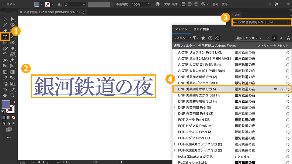 入力した文字を選択した状態で、「文字パネル」(ウインドウ → 書式 → 文字)を開きます。検索ボックス⓷の右にある「v」をクリックし、プルダウンのフォントメニュー④から使用したいフォントを選びます。