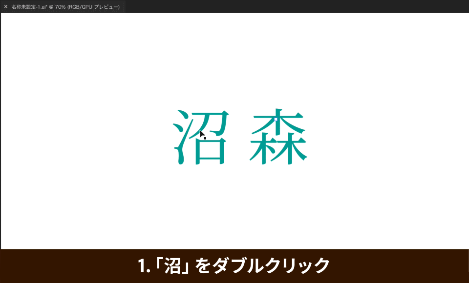 「文字ツール(T)」を選択し、アートボード上をクリックして「沼 森」というテキストを作成します。続いて、フォントを選択し、アウトラインを作成します。