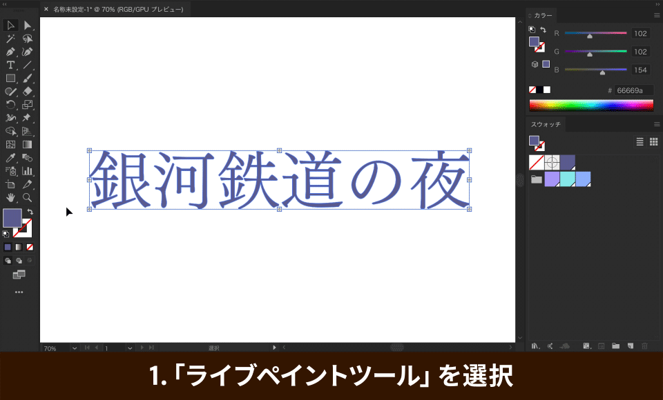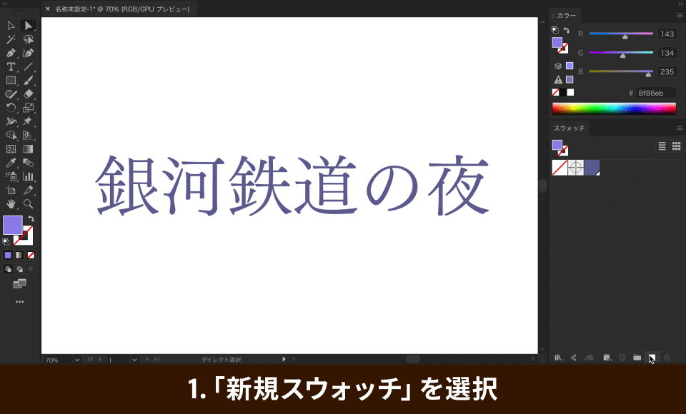 「文字ツール(T)」①を選択し、アートボード上をクリックして「銀河鉄道の夜」というテキストを作成します②。