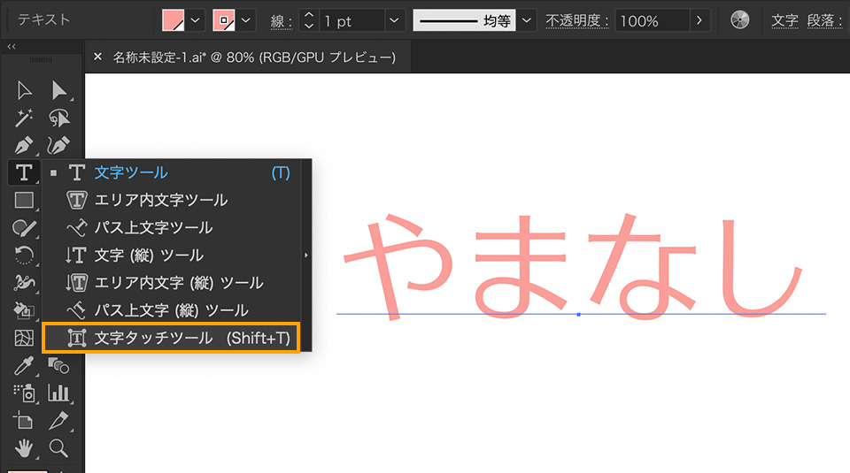 「文字ツール(T)」を選択し、アートボード上をクリックして「やまなし」というテキストを作成します。文字パネルからフォントを選択したら、ツールパネルで「文字タッチツール(Shift + T)」に切り替えます。