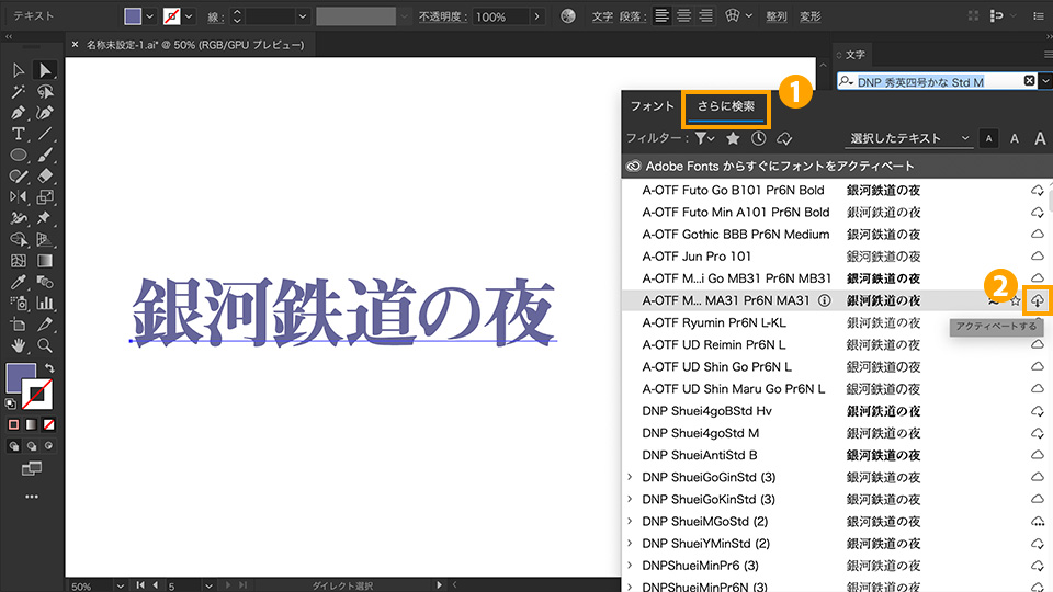 Illustratorでは、コンピューターにインストールされたフォント以外にも、Creative CloudのフォントサービスであるAdobe Fontsから様々な種類のフォントを検索して使用できます。「文字パネル」から表示したフォントメニューの「さらに検索」タブ①をクリックすると、Adobe Fontsで使用可能なフォントがすべて表示されます。使用したいフォントの右端にあるクラウドマーク②をクリックすると、フォントがアクティベートされ、Illustratorやその他のアプリで使用できるようになります。