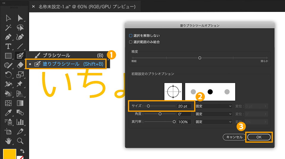 次に「塗りブラシツール(Shift+B)」①を選択し、ツールアイコンをダブルクリックしてオプションを表示します。ブラシのサイズ②を「20pt」に変更し、「OK」③をクリックします。