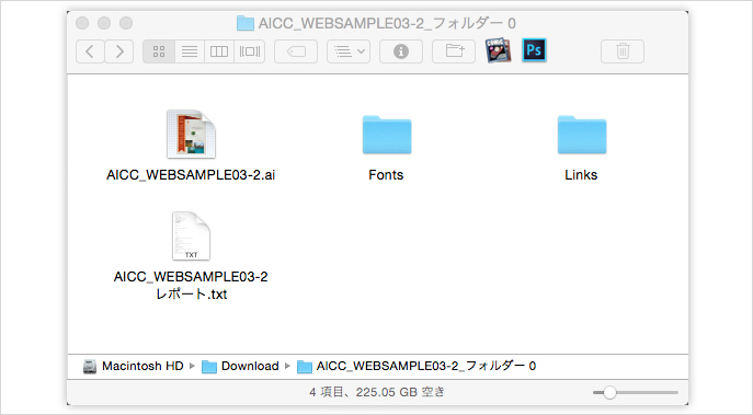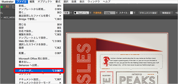 使い方は至って簡単です。ファイルを保存したら「ファイル>パッケージ」を実行するだけです。あとはIllustratorがファイルに配置されたリンク画像やフォントなど印刷に必要なファイルを一つのフォルダーにまとめてくれます。入稿データだけでなく、アーカイブする際にも役立ちます。