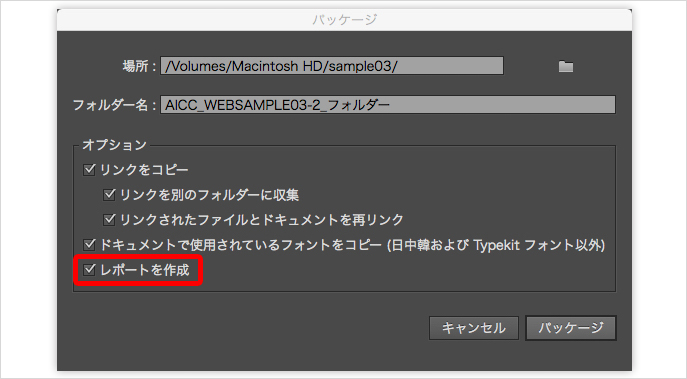 「レポートを作成する」にチェックを入れておくと、パッケージ作成の際にエラーが出た場合など原因を知ることができます