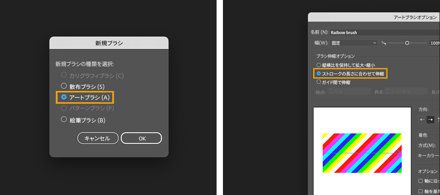 新規ブラシダイアログボックスで、「アートブラシ」を選択して「OK」をクリックします。ブラシに名前を付け、「ストロークの長さに合わせて伸縮」を選択して「OK」をクリックします。