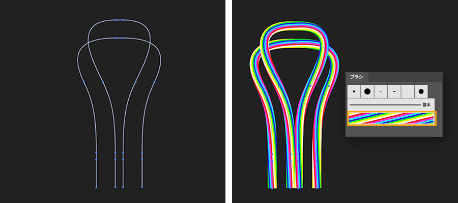 選択ツールを選択し、Shiftキーを押しながらクリックして両方のパスを選択します。次に、ブラシパネルで新しい虹色のブラシをクリックしてパスに適用します。