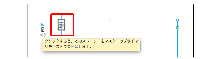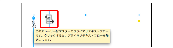 また、親ページ上に作成されたテキストフレームを選択すると、テキストフレーム左上の所にテキストフレームの自動生成フローのオン/オフを切り替えるアイコンが表示されるようになっています。このアイコンをクリックして、テキストフレームの自動生成フローを無効にしておくと、新規でこの親ページをベースとしたドキュメントページを追加しても、追加したページにはテキストフレームは作成されません。