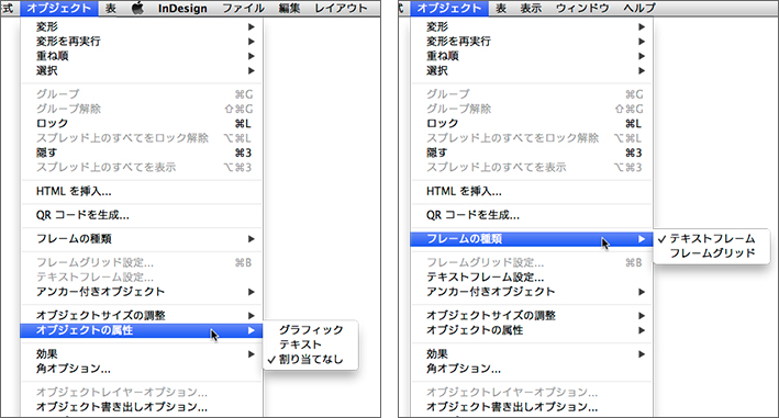 フレームの属性や種類は[オブジェクト]メニューの[オブジェクトの属性]や[フレームの種類]から変更することもできます
