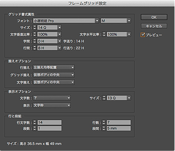 [フレームグリッド設定]ダイアログ。フレームグリッドの場合、このダイアログの設定内容でテキストが入力・ペーストされます