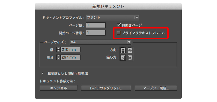 [新規ドキュメント]ダイアログには[テキストフレームの自動生成]という項目があり、デフォルトではオフになっています。この項目は CS5.5 までは[マスターにテキストフレーム]という名称でしたが、CS6 から[プライマリテキストフレーム]という名称に変更され、その機能も大きく進化しました。