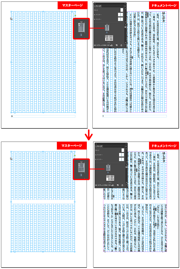 1段組の「A-親ページ」が適用されていたページに、テキストフレームの自動生成フローを有効にした2段組みのマスターページ「B-親ページ」を適用すると、即座にレイアウトに反映されます