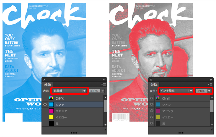 [分版]パネルの[表示]に[色分解]を選択し、各版の表示・非表示を切り替えることで、それぞれの版の状態を確認できます。また、[表示]に[インキ限定]を選択してフィールドに数値(%)を入力すると、その数値を超える箇所がハイライト表示されます。[インキ限定]は、総インキ量のチェックをしたい場合に使用すると便利な機能です。
