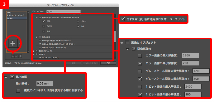 ただ単に、ライブで(制作しながら)プリフライトできるようになっただけではありません。チェックする内容を細かくカスタマイズすることが可能となりました。もちろん、仕事の内容に合わせてプロファイルを使い分けることもできます。チェックする画像解像度の指定や最小線幅の指定をはじめ、これまでとは比べ物にならないくらい多くの項目のチェックが可能となっており、より安全なデータ作成が実現できます。