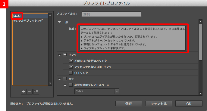 [プリフライトプロファイル]ダイアログが表示されるので、まず左側のリストから[基本]を選択してみましょう(これがデフォルトで設定されているプロファイルです)。