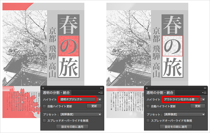 [透明の分割・統合]パネルの[ハイライト]を指定すると、その選択した内容にマッチする箇所をハイライト表示できます。とくに透明機能を使用した際には、チェックするようにしておきましょう。