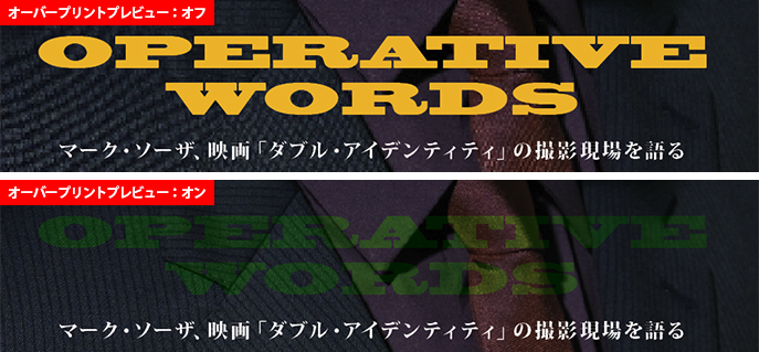 なお、[スウォッチ]パネルの[黒]を100%で適用した箇所は、デフォルト設定では自動的にオーバープリントが適用されるようになっています。図は[オーバープリントプレビュー]がオフの場合とオンの場合。[オーバープリントプレビュー]をオンにしたことで、表示が変わったのが確認できます。
