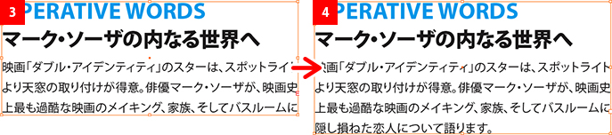 エラー項目の部分をダブルクリックすると、拡大表示された状態で自動的にエラー箇所に移動します。目的に合わせて問題点を修正しましょう。ここでは、テキストフレームを大きくしてテキストのあふれを解消しました。