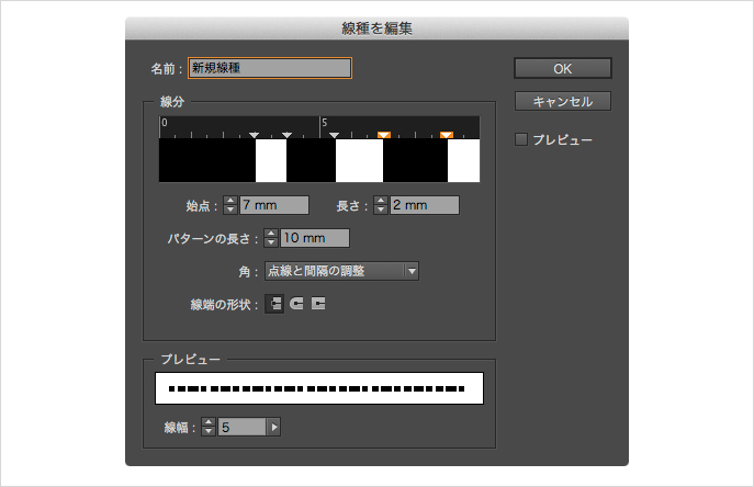 [線]パネルのパネルメニューから[線種]を選択して、[線種]ダイアログで[新規]ボタンをクリックすると、[新規線種]ダイアログが表示され、オリジナルの[線種]を作成することが可能となります