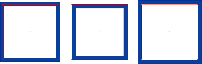 [線]パネルの[線の位置]では、線幅を適用する際にどのように線を太らせるかを指定できます。図は同じサイズのパスに線幅を適用したものですが、それぞれ線の太り方が異なります左から[線の位置]に「線を中央に揃える」「線を内側に揃える」「線を外側に揃える」を指定したもの