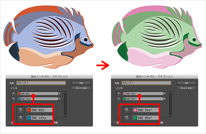 使用している特色を変更したい場合には、混合インキグループの親スウォッチをダブルクリックして、[混合インキグループオプション]ダイアログを表示させ、インキを変更すればOKです混合インキグループすべのスウォッチが変更され、ドキュメントで使用しているカラーも自動的に修正されます