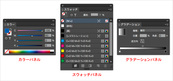 グラデーションの指定は[グラデーション]パネルから行いますが、[スウォッチ]パネルからグラデーションスウォッチを作成してオブジェクトに適用することもできます。