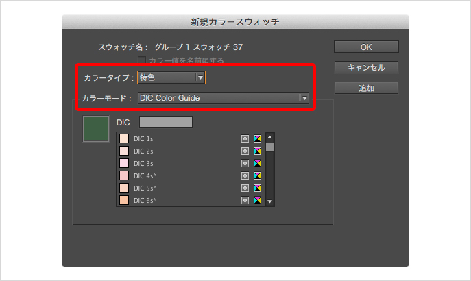 [新規カラースウォッチ]ダイアログで[カラータイプ]に[特色]を選択することで、特色スウォッチの登録が可能になります。[カラーモード]では、DICやPANTONEなどの特色を選択できます