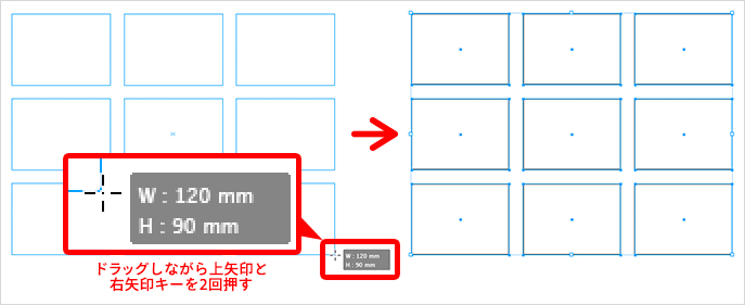 例えば、同じ大きさの長方形を複数作成する場合、長方形ツールでドラッグしながら矢印キーを押してみてください。押した矢印キーの向きに応じて、描画される長方形が行・列に分割されるはずです。