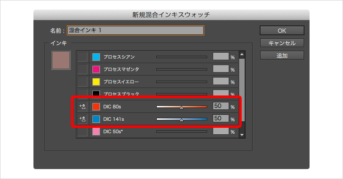混合インキは、[新規混合インキスウォッチ]ダイアログで作成します掛け合わせたいインキを2つ以上(最低でも1つの特色が含まれている必要があります)選択し、それぞれ濃度を指定します