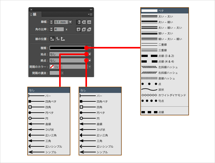 [線]パネルでは、線幅や線端・角の形状が指定できるだけでなく、[種類]や[始点][終点]の指定もできます。また、[種類]に点線や二重線を指定した場合には、[間隔のカラー]とその[濃淡]も指定できます。