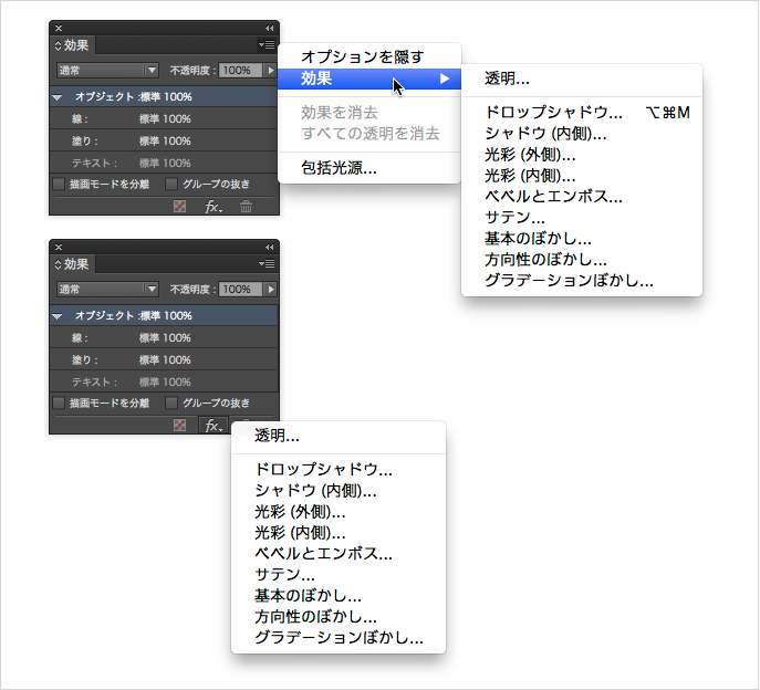 [効果]ダイアログの[設定の対象]を切り替えることで、「オブジェクト」「線」「塗り」「テキスト」のそれぞれに対して効果を適用することができます