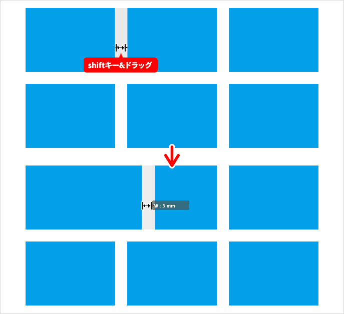通常、同じ間隔で並ぶオブジェクトが複数ある場合、すべての間隔が調整されてしまいますが、特定の間隔のみを調整(移動)したい場合にはshiftキーを押しながらドラッグします