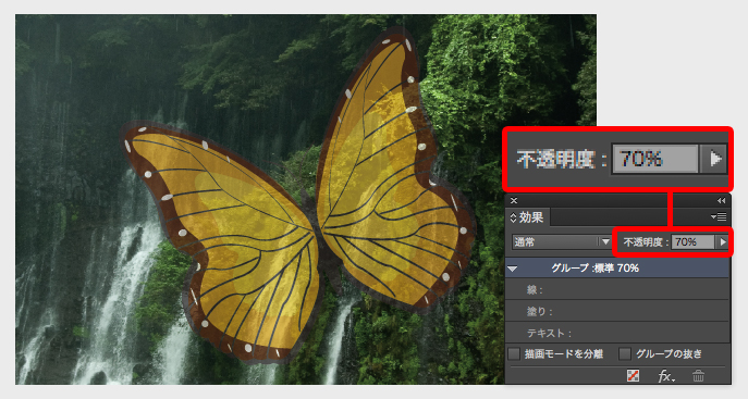 不透明度を設定することで、背景を透かして表現することができます。図は蝶のイラストに[不透明度]を「70%」適用したものですが、背景が透けて見えているのが分かります