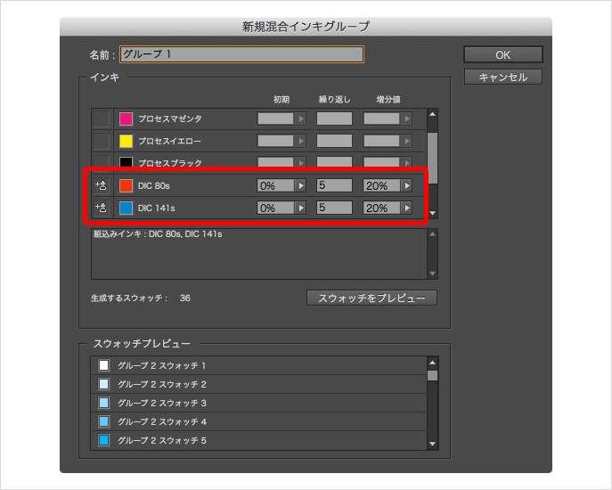 複数の混合インキを一気に作成したい場合には、[新規混合インキグループ]ダイアログを使用します掛け合わせたいインキの選択と「初期」「繰り返し」「増分値」を設定します