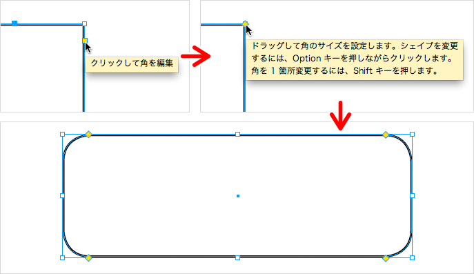 また、角の効果は[オブジェクト]メニューの[角オプション]から設定できますが、CS5からはマウス操作のみで角を設定することも可能になっています。