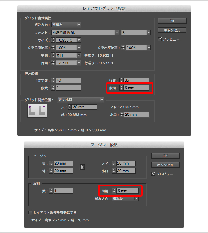 グリッド化される際のオブジェクトの間隔は、[レイアウトグリッド設定]ダイアログの[段間]、または[マージン・段組]ダイアログの[間隔]の値が参照されます